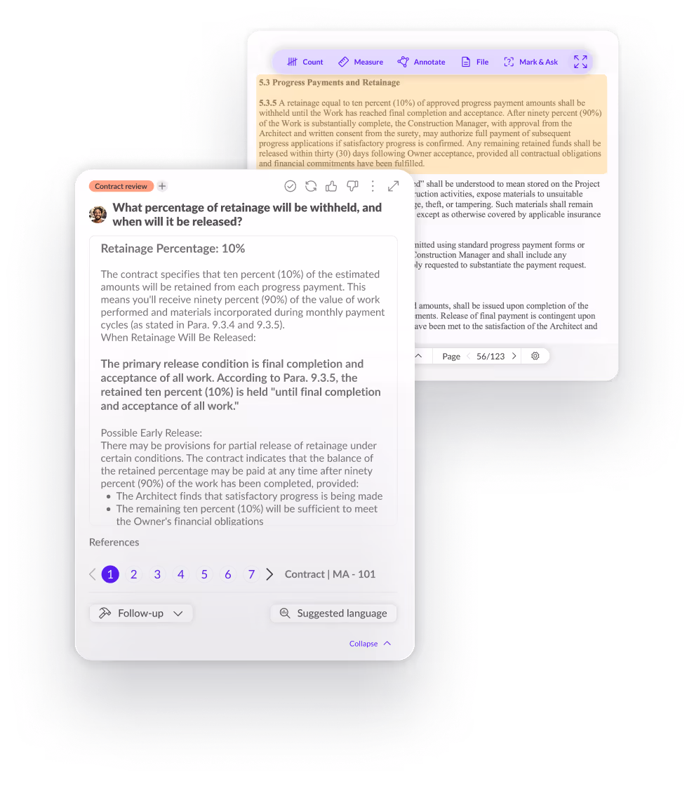 Pelles supports legal teams by analyzing complex contract language to surface key obligations, changes, and potential risks early in the process. Instead of relying on slow, manual review, teams gain faster visibility into what could impact scope, cost, or responsibility, allowing risks to be assessed, addressed, and planned proactively. By bringing critical issues to light sooner, Pelles helps reduce exposure, support stronger negotiations, and enable more confident decisions across every project.