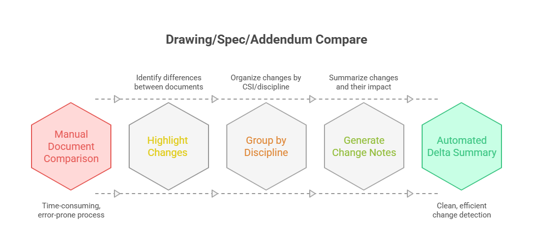 You could prompt GenAI in various valuable ways, like ‘Highlight changes, group them by CSI/discipline, and return side-by-side citations (old vs. new). Require a short “change note” for each item, including what changed and the likely cost and time impact.’’ With this use case, estimators can route quick follow ups to vendors and generate clarifications without having to start from scratch.