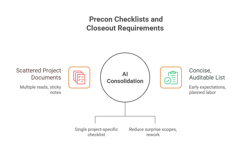 What used to require multiple reads and sticky notes becomes a concise, auditable list with the help of AI. An intelligence layer like Pelles can consolidate preconstruction requirements like coordination notes and phasing constraints that are usually scattered across divisions and addenda. This automation puts them into a single, project-specific checklist, helping you set expectations and plan labor accordingly.